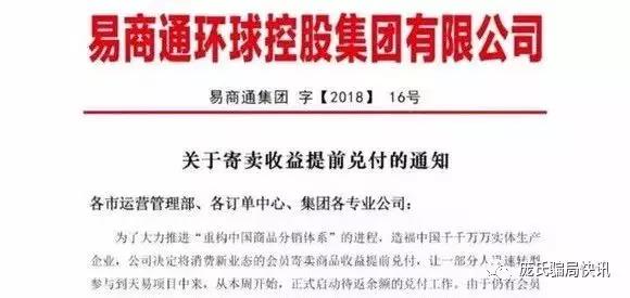 5月21日,易商通公司再次发出通知称,决定将消费新业态的会员寄卖商品收益提前兑付,让部分人迅速转型参与到“天易商城”项目中来,从本周开始,正式启动待返余额的兑付工作。同时对易商通持有怀疑态度,散布负能量的公员上报至北京易军通科技股份有限公司,优先结算并进入黑名单,并承诺在7月30日以前返还所有会员的全部金额。