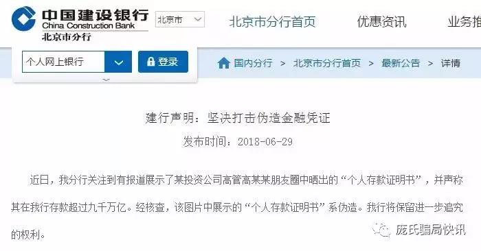 6月29日,建设银行北京市分行发布通告辟谣称,高志华朋友圈中晒出的“个人存款证明书”系伪造。我行将保留进一步追究的权利。