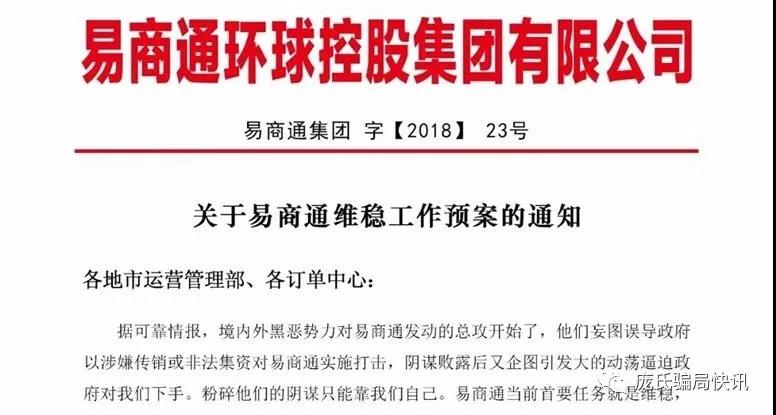8月17日,易商通公司发通知称,境内外黑恶势力对"易商通"发动的总攻开始了,他们妄图误导政府以涉嫌传销或非法集资对其实施打击。公司总部决定成立维稳工作领导小组。