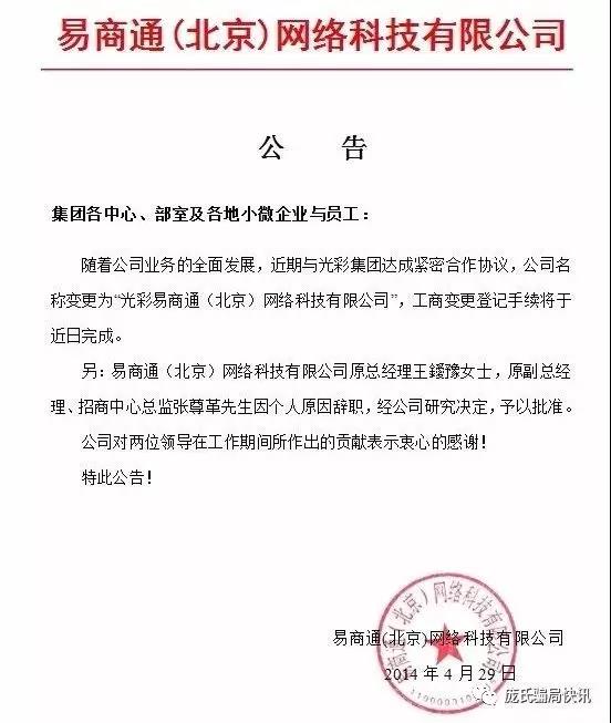 2014年4月29日,北京易商通公司发公告称,近期与光彩集团达成紧密合作协议,公司名称变更为光彩易商通(北京)网络科技有限公司(以下简称:光彩易商通公司)。