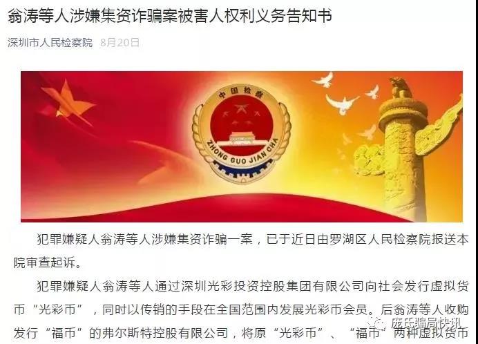 今年8月28日深圳市人民检察院通告称,犯罪嫌疑人翁涛等人通过深圳光彩投资控股集团有限公司向社会发行虚拟货币“光彩币”,同时以传销的手段发展会员。后翁涛等人收购“福币”,将原“光彩币”、“福币”及会员合并,向社会推出“凯富K”积分,通过积分兑换股权等方式继续非法集资,后无法按时兑付投资者的投资款。犯罪嫌疑人翁涛等人涉嫌集资诈骗一案,已于近日由罗湖区人民检察院报送本院审查起诉。