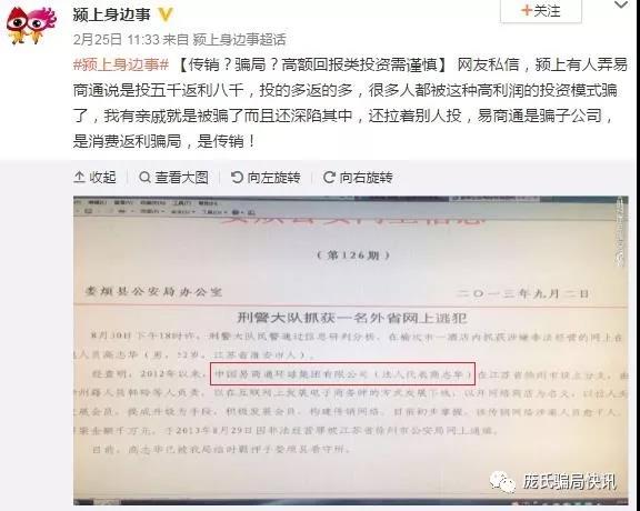 2月25日,微博大V颍上身边事,发微博称自己的亲戚深陷“易商通”传销骗局。在配图中有一张是娄烦县公安局2013年刑警大队抓获外省逃犯的文件。