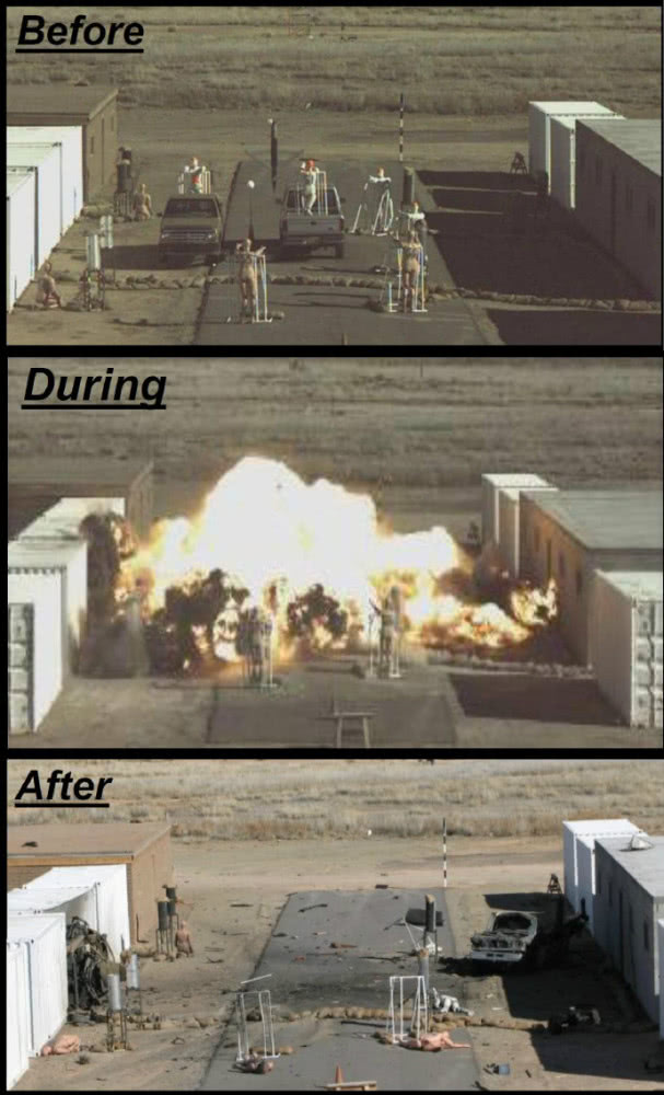 上图为同样采用"重度钝性金属高爆炸药"和碳纤维复合材料外壳的GBU-39小直径炸弹(SDB)聚束杀伤型弹药(FLM)进行实弹攻击测试的场景,可以看到被攻击后街道上的人形目标物体几乎被完全摧毁(包括2辆皮卡车),而街道两侧的房屋相对保存较为完整。