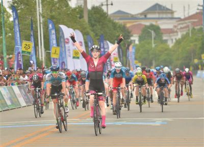 9月23日,第九届环鄱赛第十一站的比赛在上犹县举行。图为赛站冠军冲过终点后挥臂庆祝。