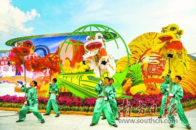 广东庆祝首届“中国农民丰收节”主会场活动现场。图为舞狮贺丰收。南方日报记者 何森垚 摄