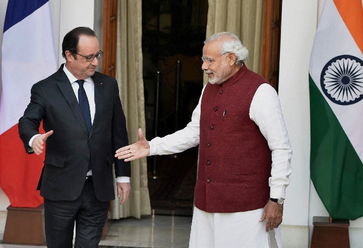 2016年1月25日,在印度新德里,印度总理莫迪(右)会见法国总统奥朗德。印度总理莫迪和到访的法国总统奥朗德1月25日在新德里宣布,双方已就印度向法国购买36架“阵风”战斗机达成协议。(新华/美联)