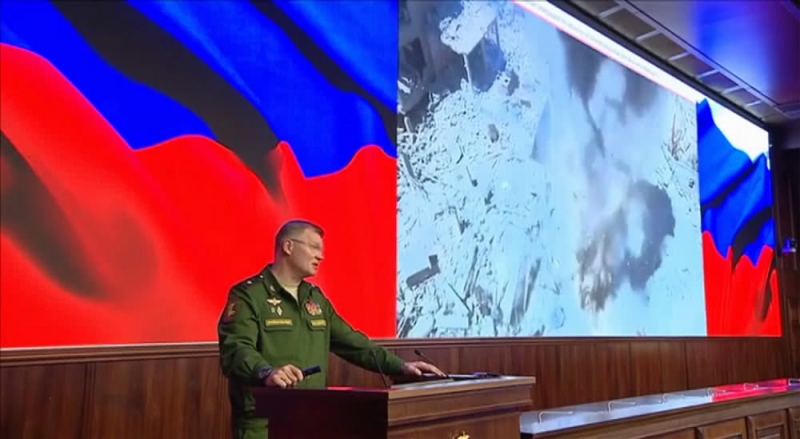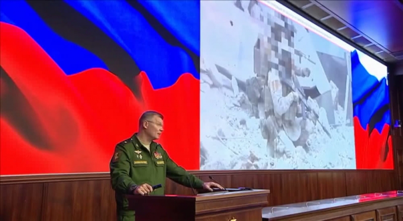 俄罗斯军队伊戈尔·科纳申科夫少将通过视频向记者和观众们介绍这次行动的具体情况,视频可以看到战斗中爆炸产生的冲击波将大量建筑物碎片冲向天空。