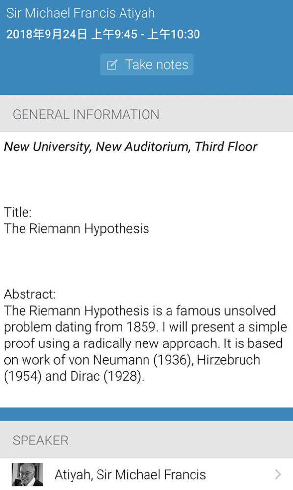 德国海德堡当地时间9月24日上午9时45分至10时30分(北京时间9月24日下午15时45分至16时30分),89岁的迈克尔·阿蒂亚(Sir Michael Francis Atiyah)爵士正在海德堡奖获得者论坛上做关于黎曼猜想的宣讲。据早先海德堡奖获得者论坛的官方消息,迈克尔·阿蒂亚称自己会给出一个“简单”且“全新”的证明方法,同时他还透露自己的证明是基于冯·诺依曼(John von Neumann,1936)、希策布鲁赫(Hirzebruch,1954)和狄拉克(Dirac,1928)的研究成果。