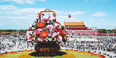 这是9月24日在天安门广场拍摄的“祝福祖国”花篮。
