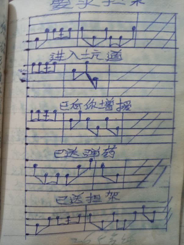 号谱中,分别有“进入坑道”、“已向你增援”、“已送弹药”、”要求增援“等分门别类的号谱,简直可以称之为一种公开的声音情报。