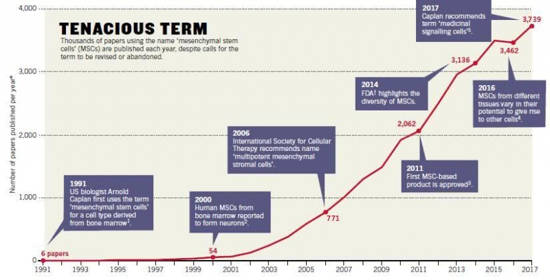 Douglas等人统计,自1991年以来,美国医学文献数据库中有超过32000和“间充质干细胞”相关的论文发表。过去10年里他们阅读到的几百篇论文显示,领域内对MSCs的认识仍是一团糟。
