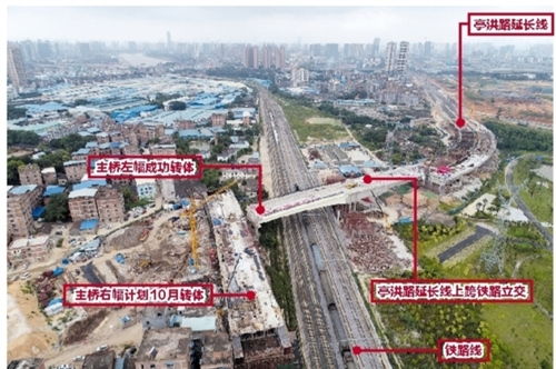 据了解,亭洪路延长线设计为东西走向,向西修建会跨越湘桂铁路、南昆客专及拟修建的南崇城际铁路。按常规修建的立交桥,往往是上跨道路搭建脚手架,或封闭下跨的道路,然后浇灌混凝土,待混凝土干后拆除脚手架,一般需要数月时间。然而,亭洪路延长线上跨的铁路要确保正常运营,且高铁对现场的施工要求更高,即动车在运营中上方不能有搭架物。