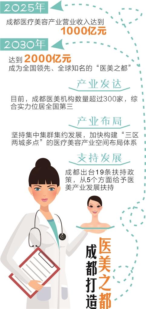 打造“医美之都”,成都全力以赴。9月28日至10月4日,“2018首届成都医疗美容节”将在成都举行。成都发达的医疗美容产业无疑为举办此次活动厚植了沃土。《成都医疗美容产业发展规划(2018-2030)》提出:以构建医疗美容产业生态圈为主线,以突出发展医疗美容服务业、加快发展医疗美容制造业、延伸发展关联产业为重点,着力提升成都医疗美容产业的质量和规模,加快聚集国内外知名医疗美容企业、机构和人才,不断增强产业竞争力、影响力和辐射带动力,到2025年,成都医疗美容产业营业收入达到1000亿元,2030年达到2000亿元,成为全国领先、全球知名的“医美之都”。