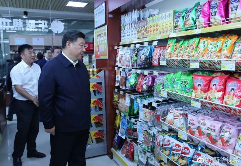 考察途中总书记走进超市问物价结束在辽宁抚顺的考察活动后,28日中午,习近平总书记乘车返回沈阳。中途在服务区短暂休息时,习近平特意走进旁边超市,仔细察看、询问商品价格和品质,还掏钱买了一袋江米条、一罐酱香什锦菜、两盒沟帮子熏鸡,一共花了131元。