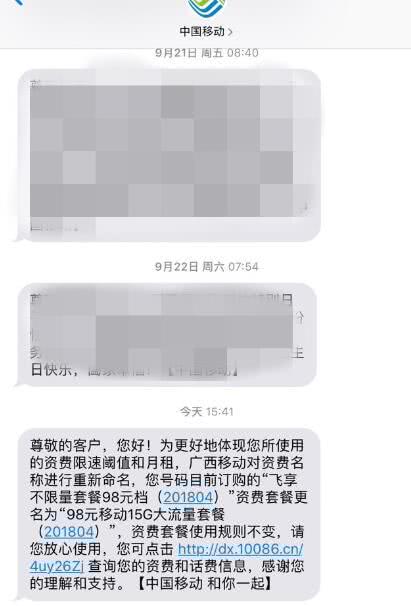 目前,中国移动已经全面开始调整不限流量,从各地用户陆续收到的短信提醒来看,他们已经将原来的“飞享不限量套餐”的名称改为了“XXXX超大流量套餐”,比如“飞享不限量套餐98元档”更名为“98元移动15G大流量套餐”。