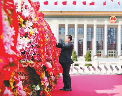 9月30日上午,党和国家领导人习近平、李克强、栗战书、汪洋、王沪宁、赵乐际、韩正、王岐山等来到北京天安门广场,出席烈士纪念日向人民英雄敬献花篮仪式。这是习近平整理花篮上的缎带。 |