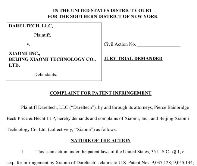 这份诉状显示,美国技术公司Dareltech,在纽约南区联邦法院起诉小米故意侵犯包括“128/144/728/716”在内的四项专利权。