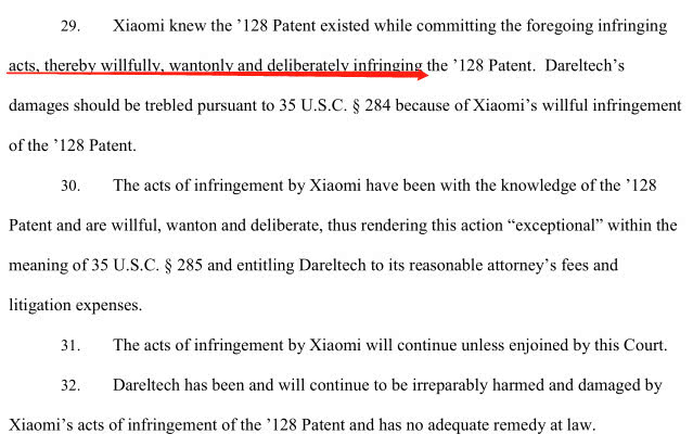 对于赔偿金额的要求,据诉状称,“明知存在专利权利,小米(还是)故意、肆无忌惮地蓄意侵犯(专利权)。(鉴于)小米的故意侵权行为,Dareltech公司(要求)损害赔偿金增加三倍。”