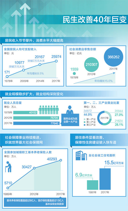 改革开放40年,是我国经济飞速发展、经济总量连上新台阶的40年,也是全体人民共享改革发展成果、生活水平大幅提高的40年。党的十八大以来,以习近平同志为核心的党中央坚持以人民为中心的发展思想,统筹做好就业、收入分配、社会保障、医疗卫生等各领域民生工作,城乡居民生活向全面小康社会更加扎实地迈进。人民群众的获得感、幸福感、安全感更充实、更有保障、更可持续。