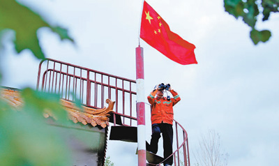 国庆期间,河北省张家口市宣化区黄羊滩林场火情观察员胡德贵在瞭望塔上观察林区情况。 |