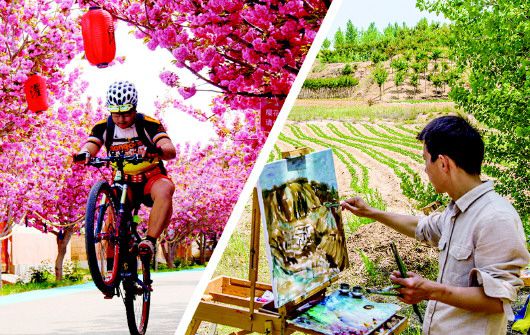 左图:莱阳市姜疃镇濯村独特的樱花景观成为其最亮丽的名片。 右图:画师在青岛西海岸新区大泥沟头村田间写生。