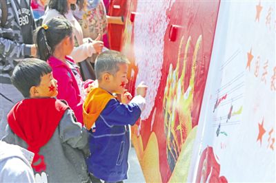 10月5日,沙坡头旅游区水车广场上,来自五湖四海的游客亲手为祖国点赞,表达爱国之情。