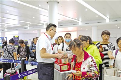 10月5日,银川河东国际机场工作人员(左一)为旅客核对托运行李单,以免错漏遗失。