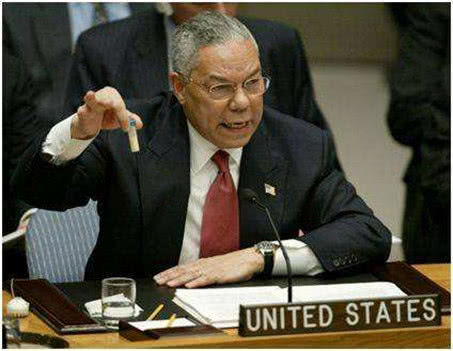 上面两张照片并排看相得益彰。左边是彭博商业周刊这次栽赃中国文章的封面,右边是2003年美国国务卿鲍威尔在联合国安理会出示所谓的伊拉克化学武器“证据”,后来被俄罗斯总统普京讥讽为洗衣粉。