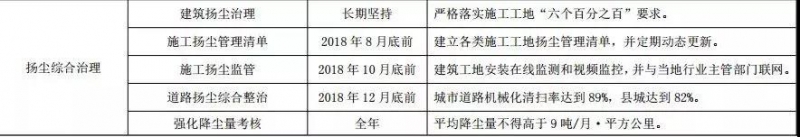 严格施工和道路扬尘监管。2018 年 10 月底前,各城市建立施工工地动态管理清单。建筑工地要做到工地周边围挡、物料堆放覆盖、土方开挖湿法作业、路面硬化、出入车辆清洗、渣土车辆密闭运输“六个百分之百”。各地 5000 平方米及以上土石方建筑工地全部安装在线监测和视频监控,并与当地有关主管部门联网。各类长距离的市政、城市道路、水利等线性工程,实行分段施工。各地要将施工工地扬尘污染防治纳入“文明施工”管理范畴,建立扬尘控制责任制度,扬尘治理费用列入工程造价;将扬尘管理不到位的不良信息纳入建筑市场信用管理体系,情节严重的,列入建筑市场主体“黑名单”;对渣土车辆未做到密闭运输的,一经查处按上限处罚,拒不改正的,车辆不得上道路行驶。大力推进道路清扫保洁机械化作业,提高道路机械化清扫率。