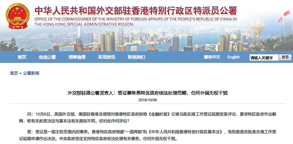 原标题:外交部驻港公署回应拒签英媒记者工作签证:任何外国无权干涉
