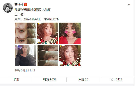 蔡依林工作起来是女王,但日常生活里却像个小女生,可爱的不行。昨天蔡依林微博发了一组自拍,嘟嘴瞪眼捂嘴,是可爱小女生拍照的模式啦。蔡依林说手机里的拍照模式有很多种,希望自己以后也能在网红界占领一席之地,有点要进军网红界的意思啊。