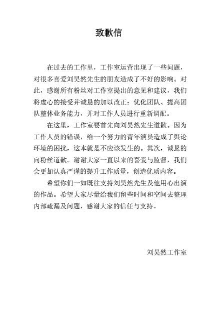 9日,刘昊然工作室在微博发表声明,向刘昊然以及粉丝诚恳道歉。声明表示,因为工作人员的错误,给一个努力的青年演员造成了舆论困扰,这是不应该发生的。并表态称将优化团队、提高团队整体业务能力。