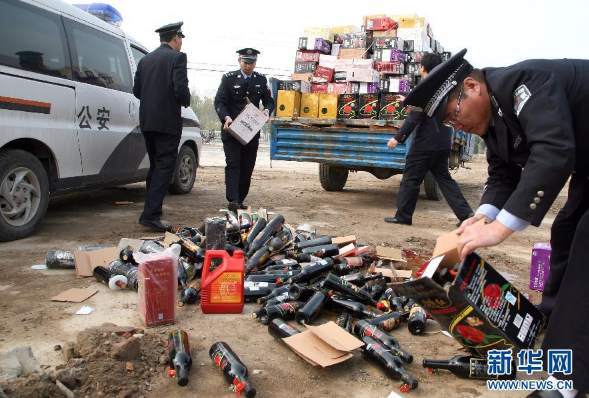 资料图 警察在销毁假冒伪劣的食品、农药等