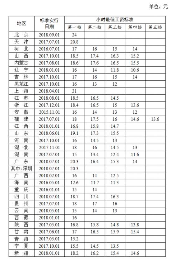 全国各地区小时最低工资标准情况(截至2018年9月),来源人社部官网