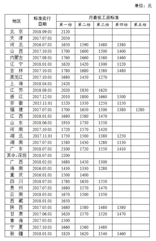 全国各地区月最低工资标准情况(截至2018年9月),来源人社部官网