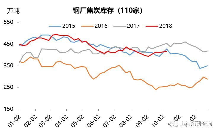 不同于往年的是,当前的钢厂的焦炭库存天数在焦炭价格相对高位的情况却有所下降,难道之前的规律不适用了么?在回答这个问题之前,我们先来看下钢厂的焦炭库存绝对量。可以看出,当前的钢厂焦炭库存绝对量处于往年正常水平,而且最近一直维持稳定甚至还小有增加。这表明,钢厂焦炭库存可使用天数的下降是由钢厂需求增加所导致的,在环保政策执行力度减弱的情况下,钢厂的需求较前期上了一个台阶。当钢厂需求平稳过渡到正常水平后,这个规律会再次起作用。回到当下,如果钢厂维持当前的高需求水平,钢厂会有强烈的补库意愿,从而带动价格的上涨,近期部分焦企的纷纷提涨便体现了这一点。