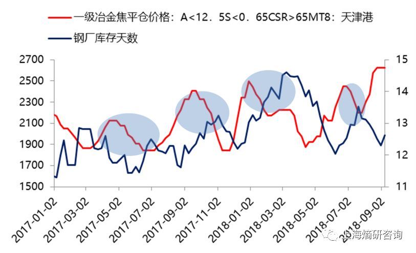 图4 钢厂的补库周期与焦炭价格之间存在着相互促进的关系