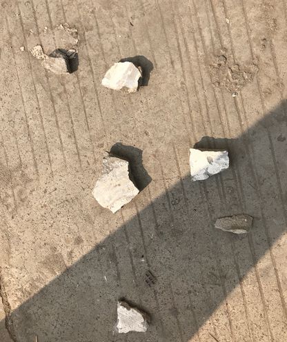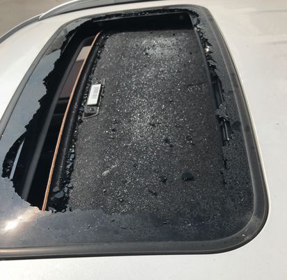 事情还要从10月8日说起,当天上午10点左右,朱师傅来到南翔万商钢材型材城一家商铺准备进点装修材料,停好车以后他和商铺老板谈生意,突然一声巨响,竟是车顶的天窗玻璃被从天而降的瓦片击碎了。