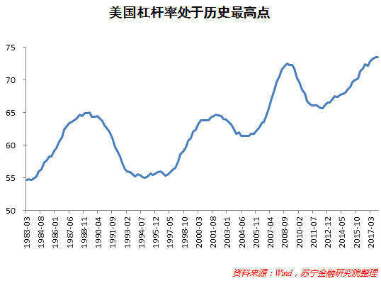 危机之后,美国经历了十年的经济强劲复苏,实体经济也处在繁荣阶段,今年第二季度实际GDP年化季环比增长4.2%,是四年来的最高水平,但高增长率是否具有可持续性?是由于居民收入本质上的增加,还是特朗普减税政策的推动?美国挑起的对各国的贸易摩擦会多大程度上恶化美国的经济?背后的不同因素体现了实体经济的泡沫程度,需要谨慎判断。债务方面,美国企业部门的杠杆率处于历史最高水平,达到73.5%。值得注意的是,上一次的杠杆率最高点也只有72.1%,时间则是2008年9月,正是金融危机爆发的时刻。