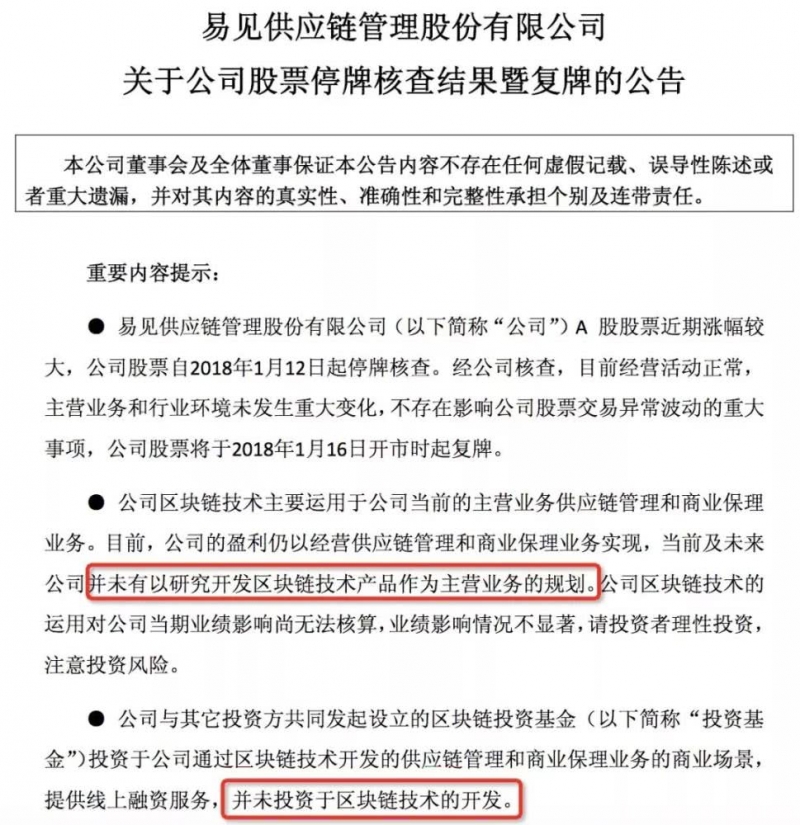 1月17日,易见股份再次停牌复查,此后收到上交所监管工作函。监管函指出,易见股份前期披露的区块链技术应用,仅是设立了线上供应链管理平台,平台所用技术与当前市场热议的区块链技术存在极大区别。前期披露的区块链投资基金,与区块链技术的研究开发并无关系。要求易见股份如实披露系列信息,并充分提示相关风险。