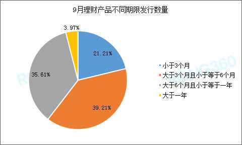 融360监测数据显示,9月份发行的理财产品中, 3个月以内(含3个月)理财产品发行数量为2194款,占比为21.21%,环比上升0.06个百分点;3-6个月期限理财产品发行量为4056款,占比为39.21%,环比上升2.85个百分点;6个月-12个月期限理财产品发行量为3683,占比为,35.61%,环比下降2.89个百分点;一年以上期限理财产品发行量占比为3.97%,环比下降0.02个百分点。