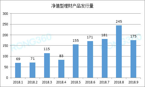 3、据融360不完全统计,2018年9月净值型理财产品发行量175款,环比减少28.57%。 发行数量排名前五的银行分别是渤海银行、宁波银行、工商银行、青岛银行和建设银行;