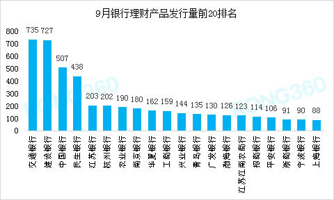 融360监测数据显示,2018年9月银行理财发行量排名第一的是交通银行,发行量为735款,其次为建设银行和中国银行,发行量分别为727款和507款。发行量前几名每月基本保持不变。