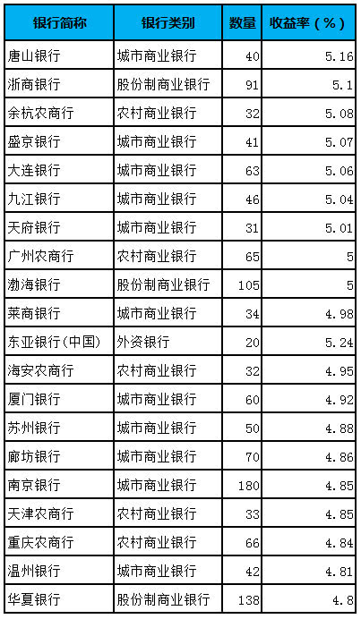 2.2 银行收益率排名:平均收益率5%以上仅剩9家
