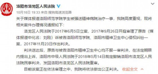 人民网北京10月17日电 据河南省洛阳市洛龙区法院官方微博消息,针对洛阳师范学院学生被强送精神病院治疗一事,河南省洛阳市洛龙区人民法院通过官方微博发布通报称,此案已发回洛阳市洛龙区人民法院重审,将依法作出公正判决。全文通报如下:
