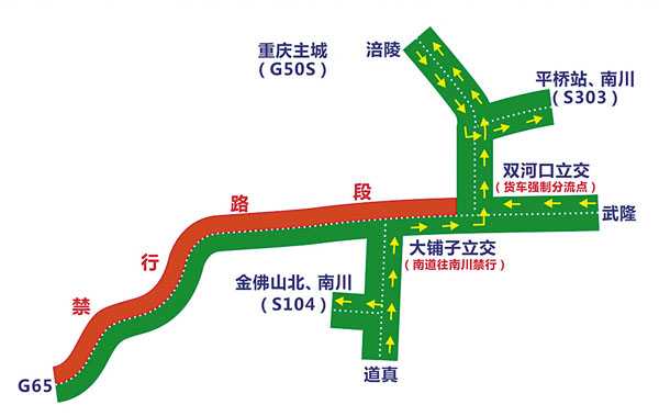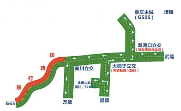 1.由武隆方向前往南川方向的所有货运车辆,在双河口立交经南涪高速公路绕行。由涪陵方向前往南川方向的所有货运车辆,在平桥收费站下道经省道S303绕行。