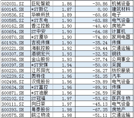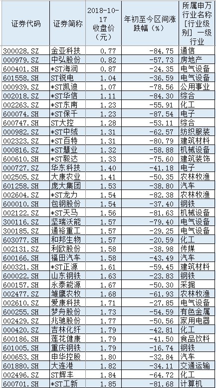截至10月17日股价低于2元/股的股票。数据来源:Wind