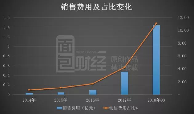 财报显示,2018年前三季度公司销售费用1.44亿元,与去年同期相比增加524.3%,销售费用在营收中的占比由去年同期的2.93%增加至11.05%。