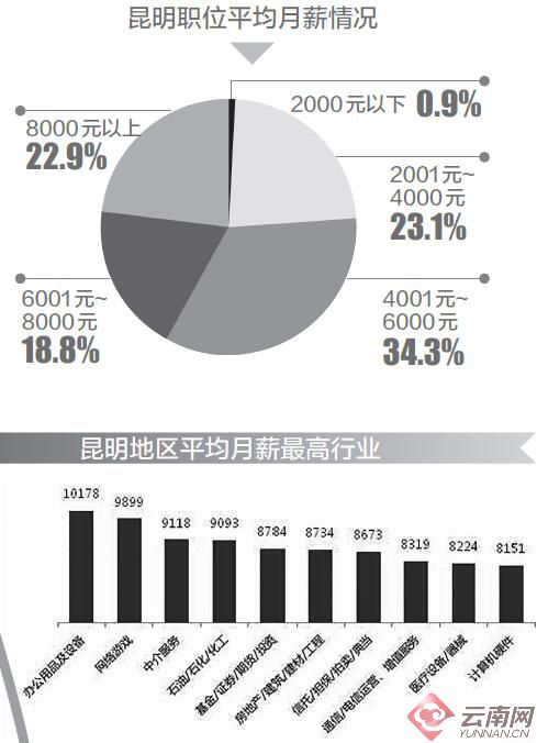 昆明哪些领域最吃香?哪些领域薪资最优厚?日前,智联招聘发布了《2018年秋季中国雇主需求与白领人才供给报告》《2018年昆明白领秋季跳槽及职业发展调研报告》。报告显示,昆明地区2018年秋求职期的平均薪酬为7100元,在全国37个主要城市的薪酬水平中排名第21位。其中,办公用品及设备行业平均月薪最高,达10178元。今年秋季昆明白领们的事业信心指数远高于去年同期。