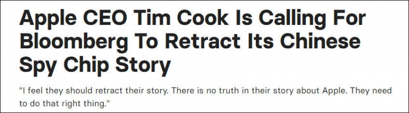 “(彭博社)他们关于苹果公司的报道没有任何真实性”,库克说,“他们需要做正确的事情,以及撤回这篇虚假报道”。